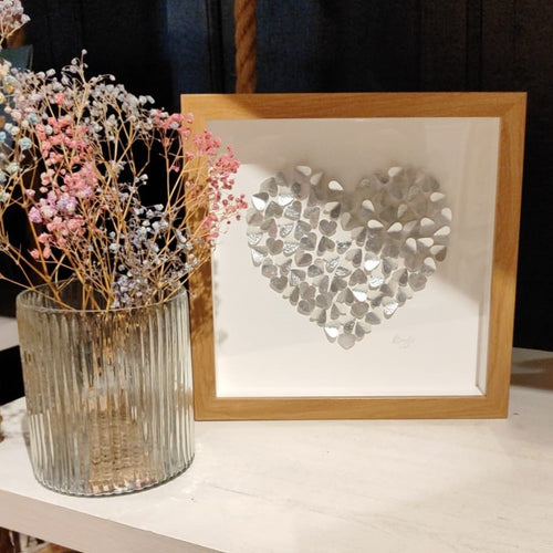 Handmade print - small oak frame - lots of tiny silver hearts in heart shape