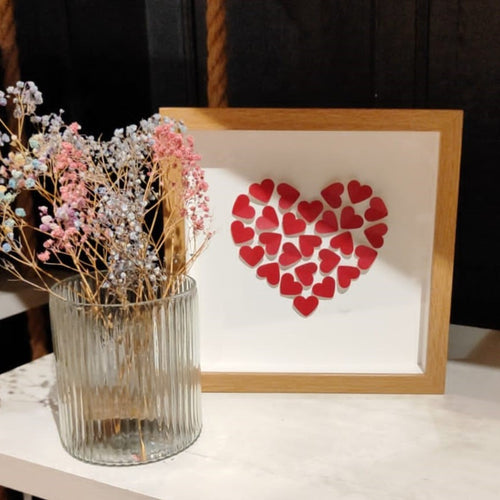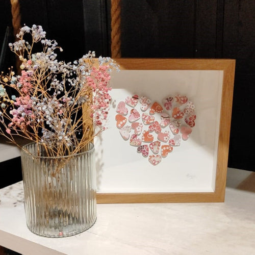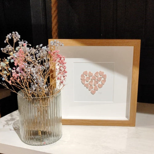 Handmade print - small oak frame - medium pink hearts in heart shape