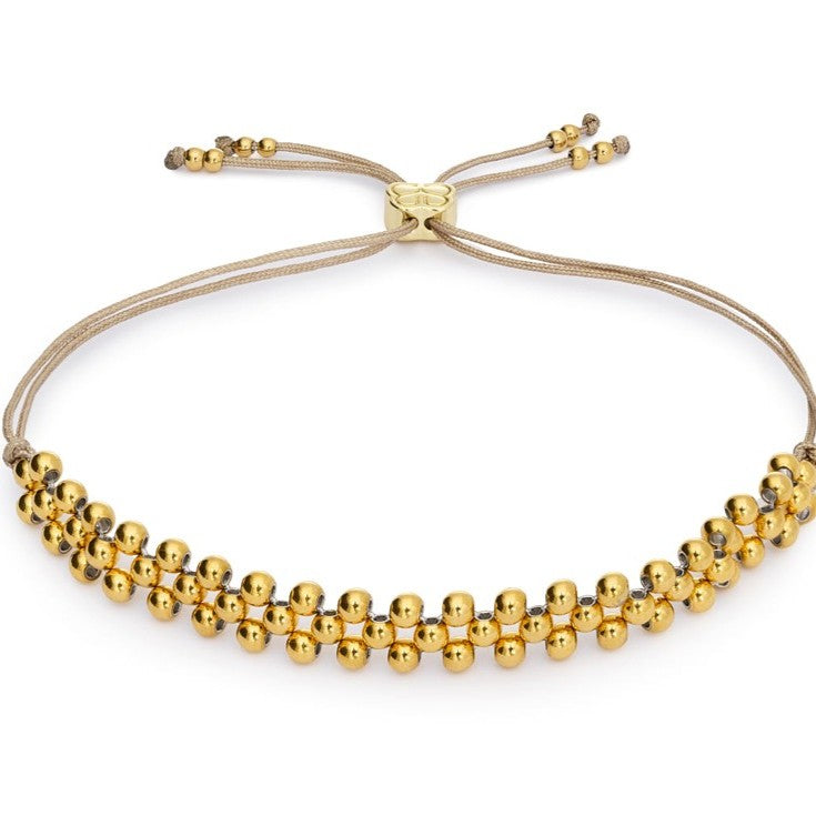 Material: 14k gold PVD-coated beads; neutral woven cord