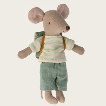 Big brother mouse is dressed for a day in kindergarten or school, carrying his backpack on the back. He has magnets in his hands so he can hold the handles of the tricycle for a fast trip.