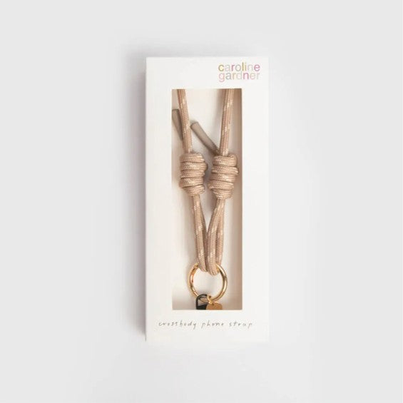 Constructed from a durable cord in taupe and white, this strap is adjustable and can be over the shoulder or crossbody, and comes with a universal d-ring adapter, allowing it to be attached to any phone case.