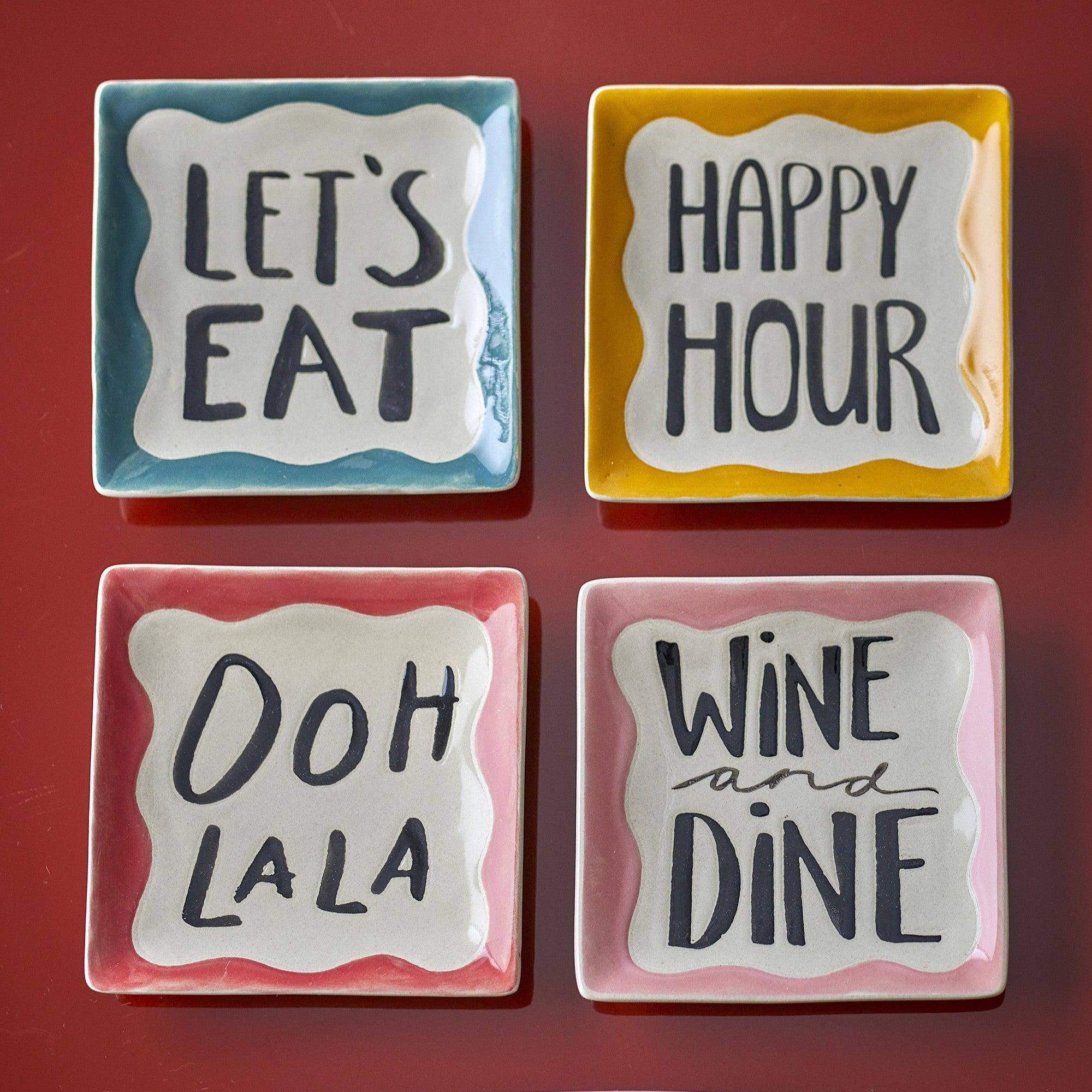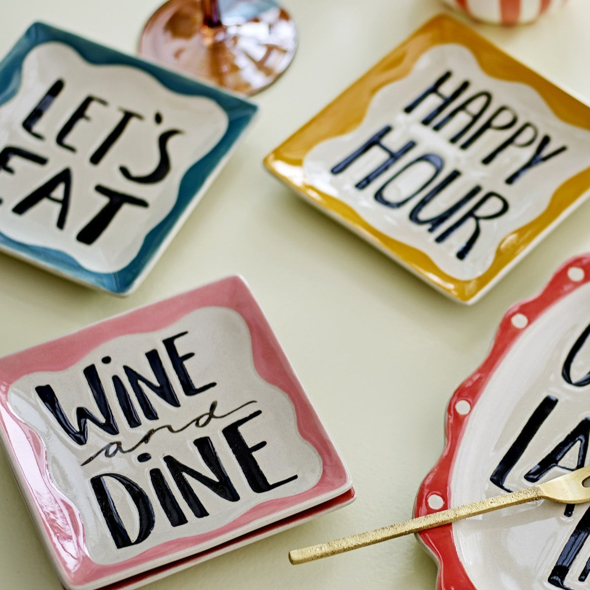 These pretty and fun stoneware plates each comes with a central cream area and hand-lettered phrase.