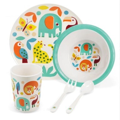 This 5 piece dinner set is made of lightweight and durable melamine and features a colourful wild animal design.