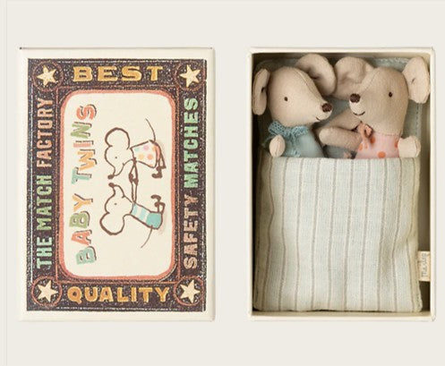Double the trouble. Baby Twins are lying nicely in their sleeping bag and comes in the popular decorated handmade matchbox. A lovely keepsake gift.