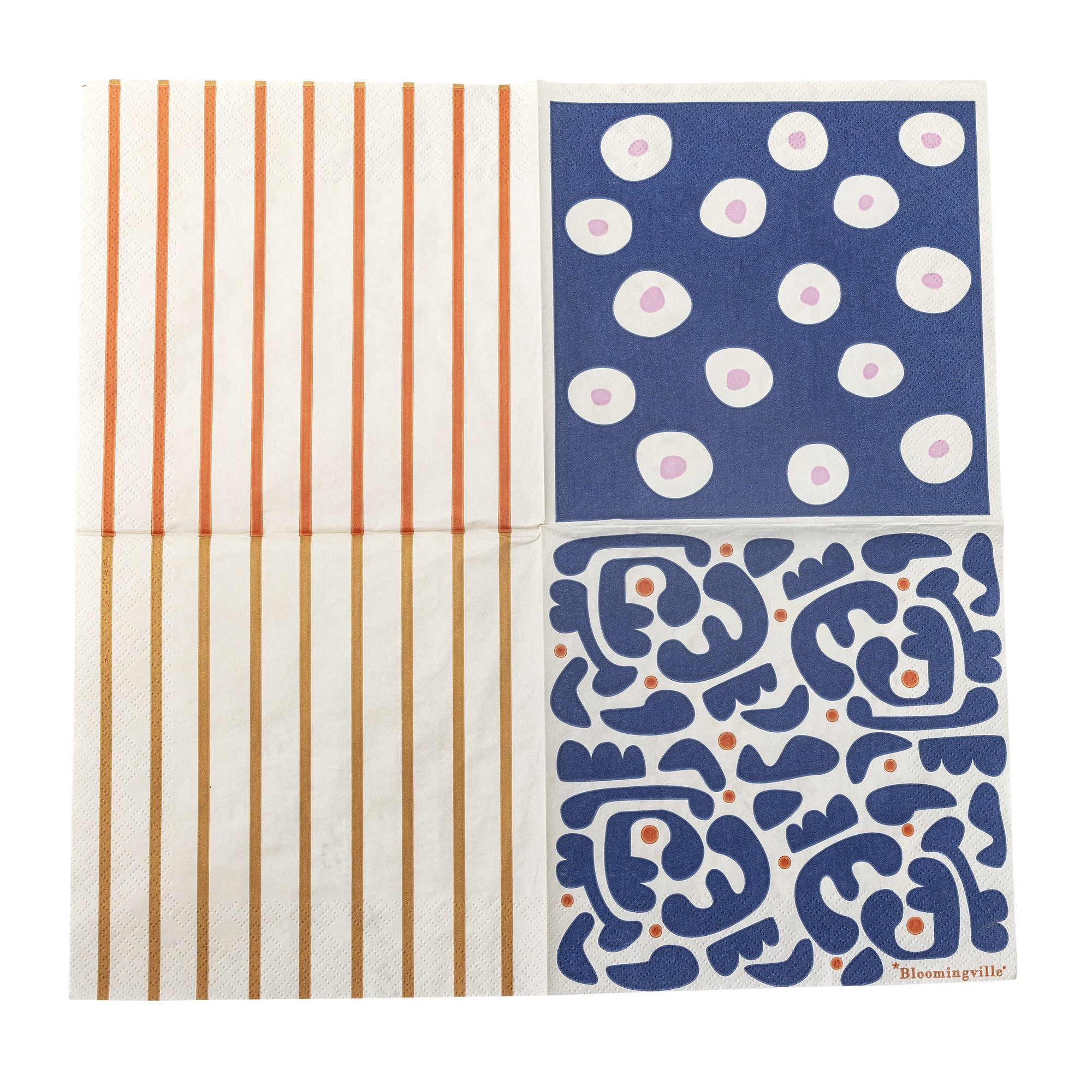 This napkin features a decorative blue pattern with dots in reddish tones, adding a touch of style to any dining table.